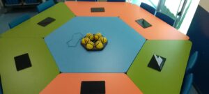 L’aula infatti è munita di tavoli modulari di diversi colori, che possono essere facilmente riorganizzati a seconda delle attività didattiche, così da promuovere un apprendimento attivo e